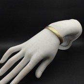 9㎜幅のバングルは、しっかりとした着け心地と、袖口からもはっきりと主張するインパクトあるボリューム感。