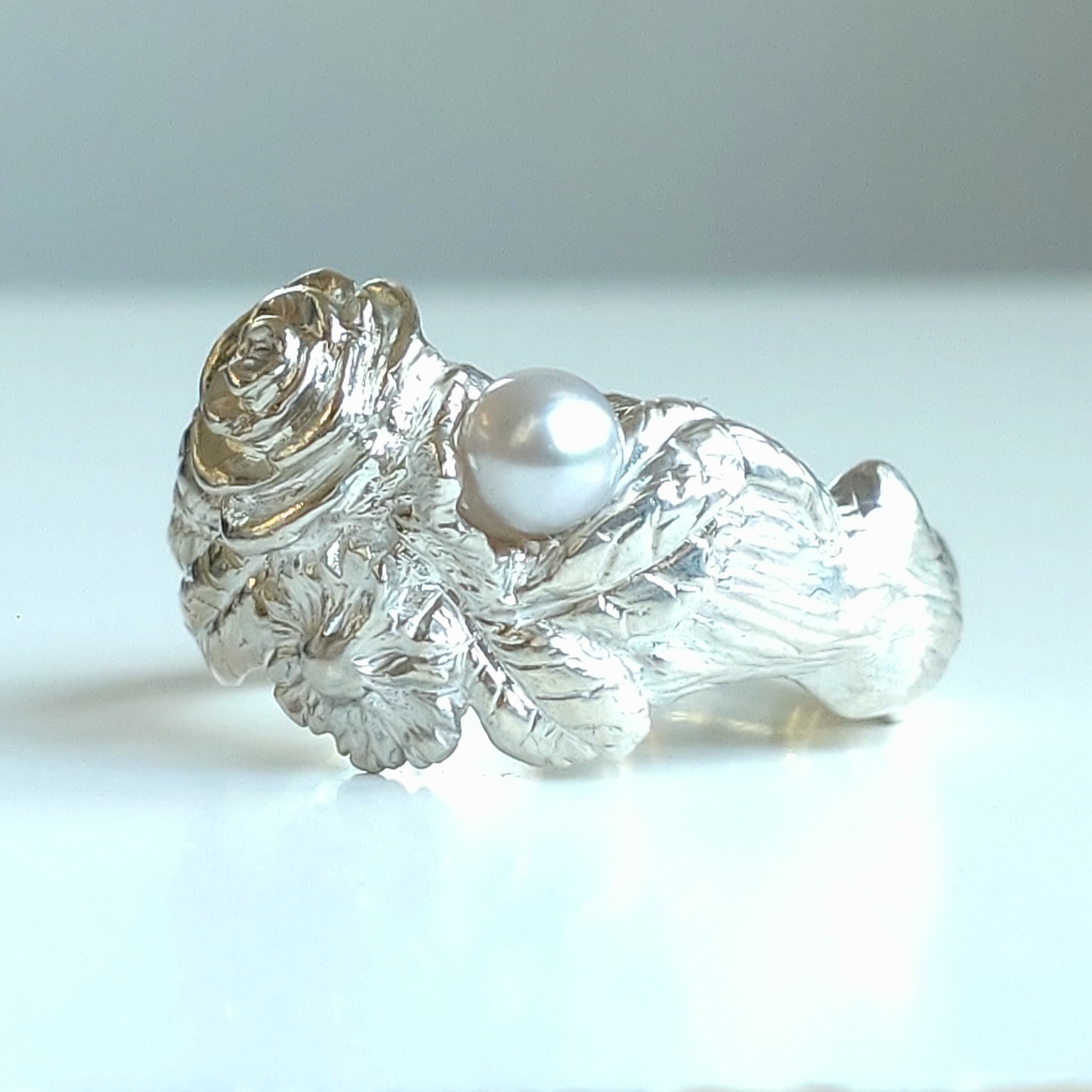 シルバー925 SV925 スターリングシルバー silver ring 指輪 植物 バラ 木の実 草花 葉っぱ 木目 薔薇 淡水パール 植物リング ローズリング シルバーリング マットリング アンティーク シルバーカラー パールリング バラのリング 繊細 お出かけ 日常使い 秋 冬 秋コーデ 冬コーデ お洒落リング レディース メンズ ユニセックス 受注生産 ボリューミー 上品 温かい プレゼント