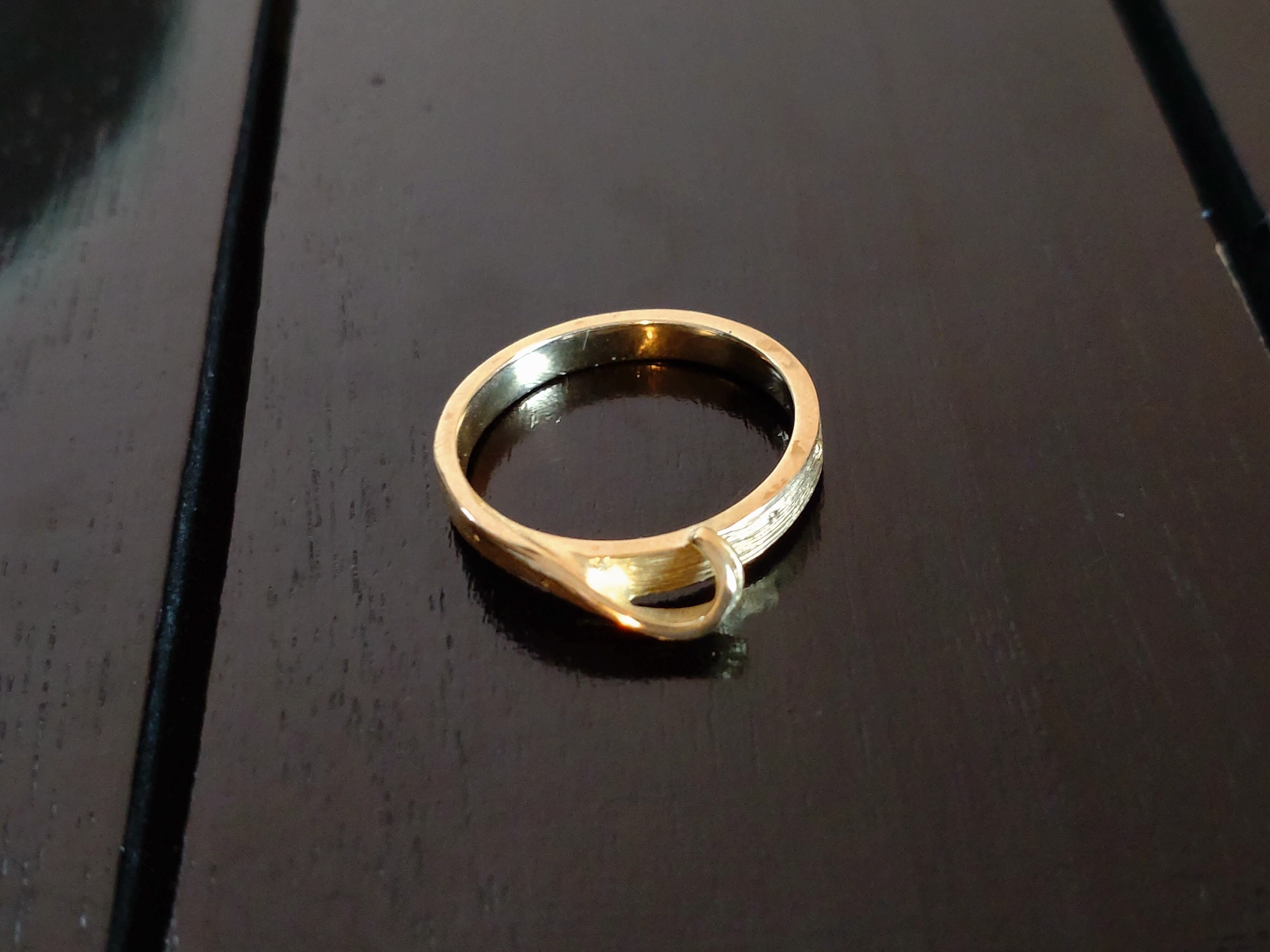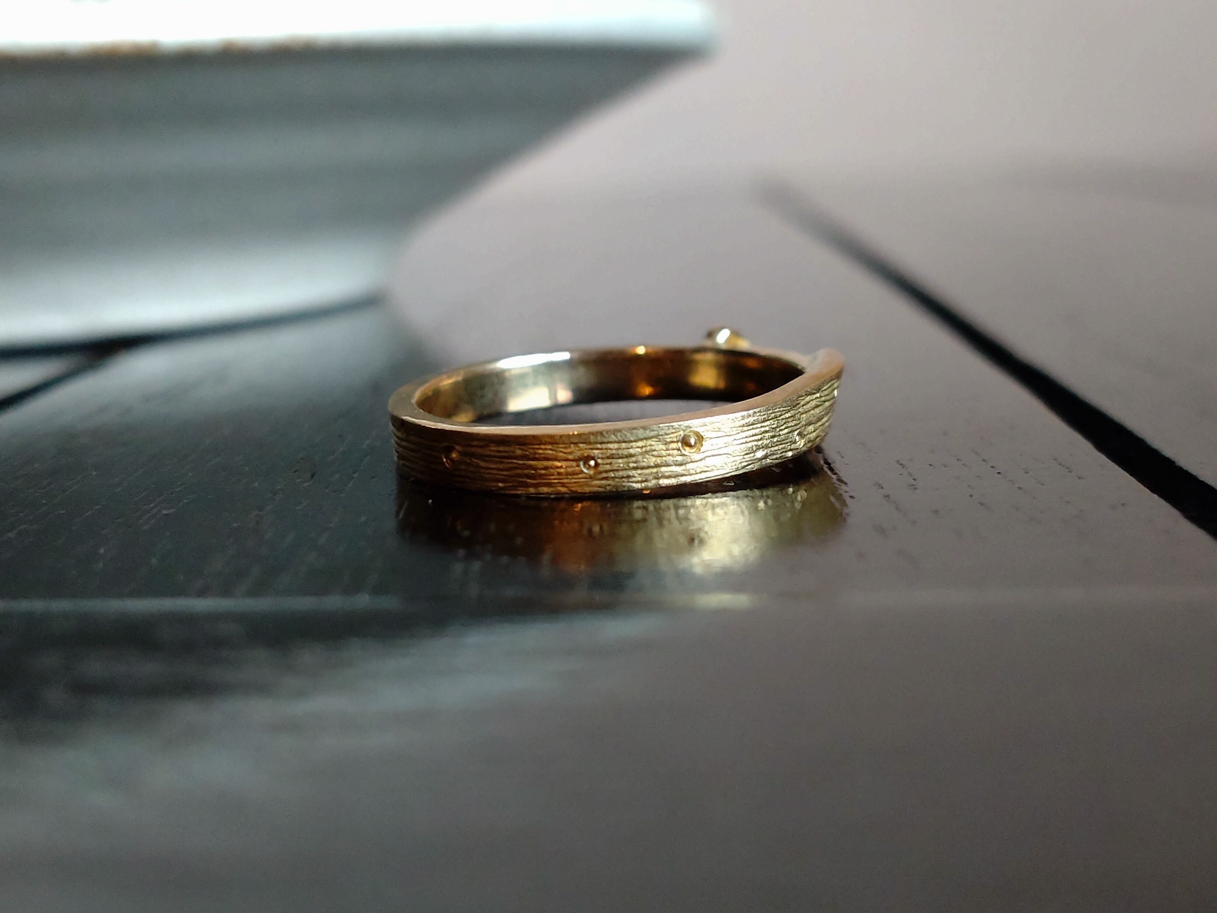 リングの側面には光沢をもたせ、表面は一方方向にラインを付け、ミルたがねを使い、土の中で光り顔を出した石達を表現し、落ち着いたマットな風合いに仕上げました。