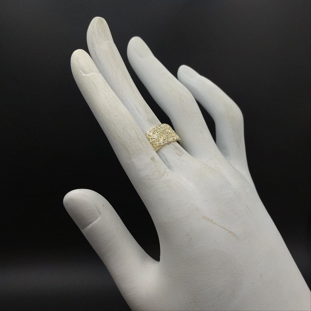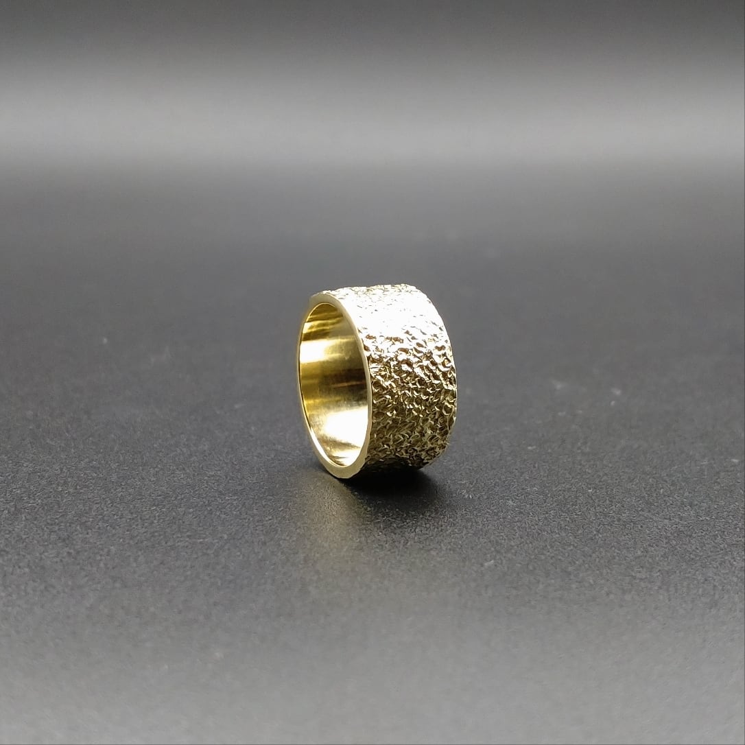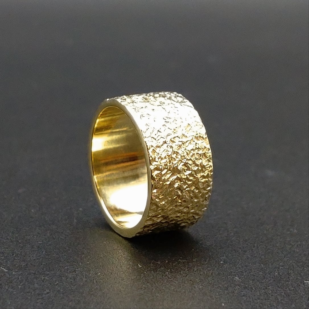 手作業で打ち込んだテクスチャーが、揺れる水面に反射する夕陽のように輝きを放つ、存在感ある幅広リングです。