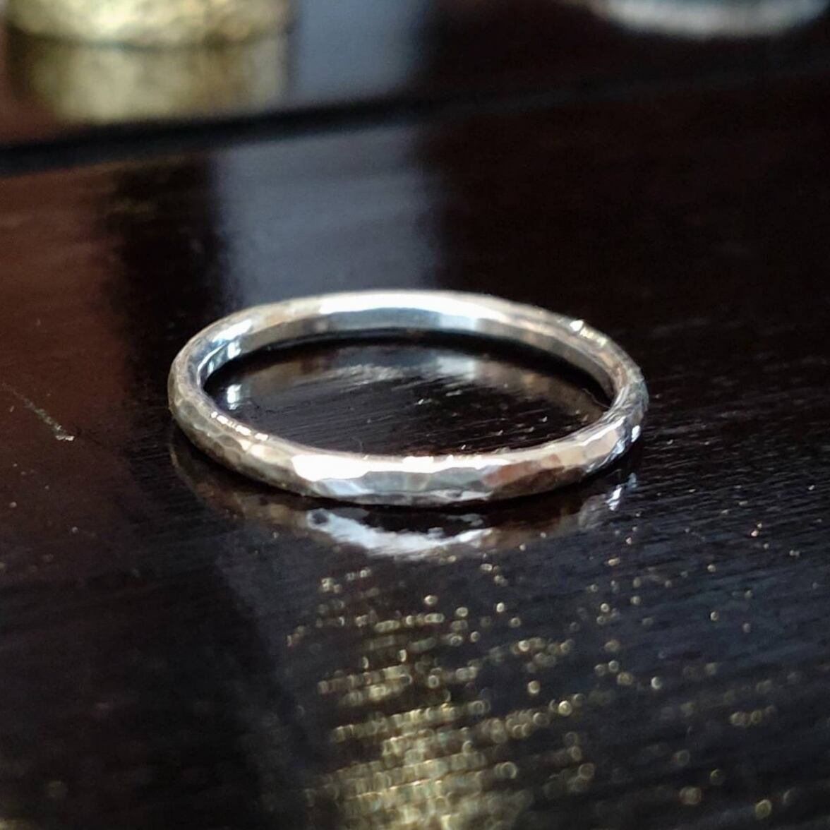 1.5㎜丸線でお作りしているので、重ね着けでも、さり気ないワンポイントとしてもどちらでもピッタリな、とても使いやすいリングに不規則に付けられた槌目が鏡面仕上げと合わさって、シンプルでキラキラとスタイリッシュなデザインの仕様となっております。