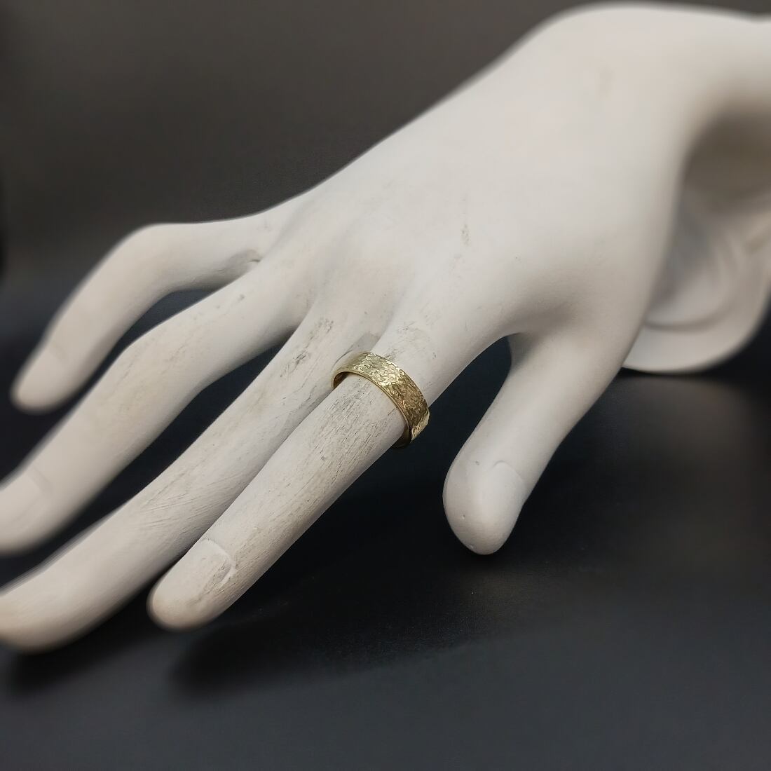 中流から上流付近のやや荒々しくも美しく流れる川を、一つ一つ手仕事でつけられたテクスチャーで表現した、シンプルなシルエットに唯一無二の自然なアジと美しさを持つリングとなっております。
